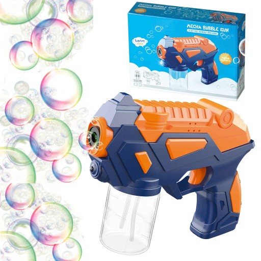 Super pistolet do produkcji bąbelków mydlanych, który po naciśnięciu na spust puszcza mnóstwo prawdziwych baniek. Wystarczy przykręcić buteleczkę z płynem, naciskać przycisk - spust a z karabinu wyleci tysiące baniek. Pokazowi tęczowych baniek towarzyszą efekty świetlne. W tylnej części pistoletu znajduje się przycisk którym możemy włączyć, lub wyłączyć efekty dźwiękowe. Wspaniała zabawka dla dziewczynek i chłopców na wiosnę i lato.