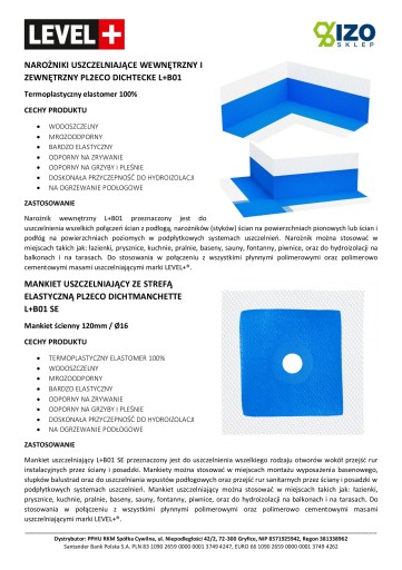 Taśma L+B01 przeznaczona jest do uszczelnienia wszelkich połączeń ścian z podłogą, narożników (styków) ścian na powierzchniach pionowych lub ścian i podłóg na powierzchniach poziomych w podpłytkowych systemach uszczelnień. Polecana jest również do uszczelniania przejść dylatacyjnych (dylatacje obwodowe, montażowe, strefowe, kontrolne) na powierzchniach poziomych, pionowych, jak i na ich styku wewnątrz oraz na zewnątrz budynków, w pomieszczeniach narażonych na czasowe lub stałe oddziaływanie wilgoci i wody. Taśmę można stosować w miejscach takich jak: łazienki, prysznice, kuchnie, pralnie, baseny, sauny, fontanny, piwnice, oraz do hydroizolacji na balkonach i na tarasach. Taśma przeznaczona jest do stosowania w połączeniu z wszystkimi płynnymi polimerowymi oraz polimerowo cementowymi masami uszczelniającymi marki LEVEL+®. Nie stosować taśmy do dylatacji konstrukcyjnych.
