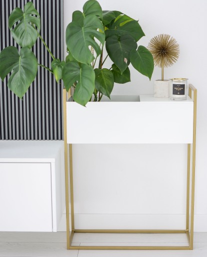 Nowoczesna, metalowa donica - stojak na kwiaty, który może też pełnić funkcję konsoli do przechowywania gazet/książek, czy przedmiotów dekoracyjnych.