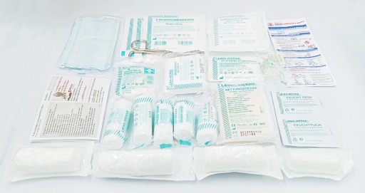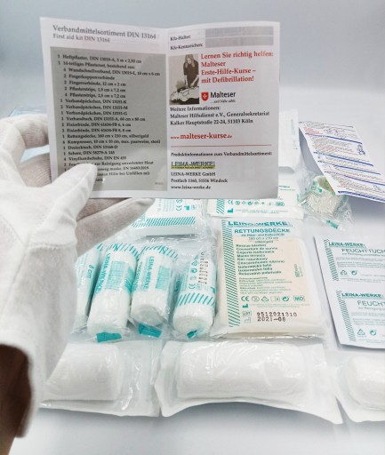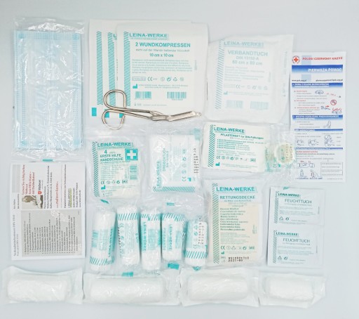 ✅ Wyposażenie apteczki pierwszej pomocy spełniające wymagania Unii Europejskiej oraz normy DIN 13164.