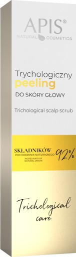 Trichological Care - Scalp Scrub marki APIS. Peeling do skóry głowy. W 92% zawiera składniki pochodzenia naturalnego. Posiada enzymatyczną formułę, która dokładnie ale jednocześnie delikatnie oczyści skalp z wszelkich zanieczyszczeń, nadmiaru sebum oraz zrogowaciałego naskórka. W swoim składzie zawiera bogactwo cennych składników: bromelinę, mocznik, resplantę z baobabu, ekstrakty z miety i żeń-szenia oraz kompleks Baicapil. Poprzez wykonywania masażu skóry głowy poprawia jej ukrwienie, a także wzmacnia cebulki i poprawia kondycję pasm. Po zastosowaniu przyswajalność wszelkich innych produktów na skórę głowy zostaje zwiększona. Dostępny jest w tubce o pojemności 80 ml.