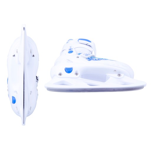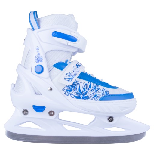 Damskie łyżwy regulowane Action Frio to nowoczesne łyżwy o atrakcyjnym, kobiecym designie. Kwiecista grafika i zimowa kolorystyka przypadną do gustu każdej dziewczynce i kobiecie. Dużym atutem jest łatwa regulacja rozmiaru za pomocą przycisku. Komfort użytkowania zapewnia miękka wyściółka wewnątrz buta - Comfort Fit, która pochłania pot, utrzymuje ciepło i pozwala stopom oddychać.