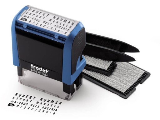Pieczątka samotuszująca z zestawem czcionek (tzw. drukarenka) Trodat 4912 TYPO. Maksymalnie 4 linii tekstu.Do drukarenki dołączone są zestawy czcionek w dwóch rozmiarach: czcionka 3 i 4 mm (zdjęcia zestawów poniżej), pinceta do składania tekstu, wkład tuszujący czarny. Dodatkowo można dokupić inny kolor tuszu (na innej aukcji, wkład tuszujący do Trodat 4912). Na zamówienie również można domówić zestawy czcionek.
