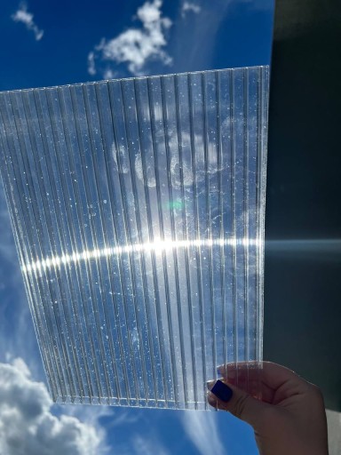 Poliwęglan komorowy (6mm)- tworzywo sztuczne należące do grupy tworzyw termoplastycznych o strukturze komory wyróżnia się wysoką wytrzymałością na czynniki zewnętrzne i mechaniczne. Materiał jest szeroko stosowany w budownictwie przy tworzeniu dachów,ścianek, zadaszeń, a także jako materiał pokrywający szklarnie. Pozwala też na wykorzystanie materiału jako izolacji podczas prac dachowych i tworzenia ogrodów zimowych.