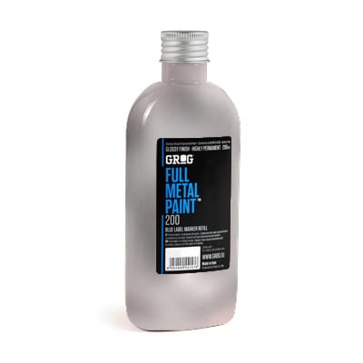 Full Metal Paint 200 jest synonimem jasnych, błyszczących kolorów i maksymalnego krycia. Dostarczany w odpornej na wstrząsy plastikowej butelce jest najlepszym wyborem do uzupełnienia całej gamy markerów Grog z niebieską etykietą. Full Metal Paint 200 jest wypełniony 200 ml farby pigmentowej na bazie alkoholu, zoptymalizowanej pod kątem markerów Squeezer. Idealny do sesji na świeżym powietrzu, świetnie sprawdza się na ciemnych powierzchniach.