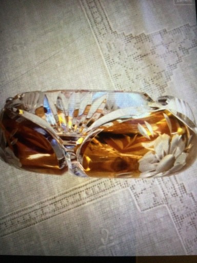 Ekskluzywna kryształowa popielnica w kolorze miodowym, wysoka jakość /wszelkie procesy obróbki i dekorowania odbywały się ręcznie przez co wyrœb jest niepowtarzalny i jedyny w swoim rodzaju. Wymiary: średnica - 14 cm, obwód - 48 cm, wysokość - 5 cm.