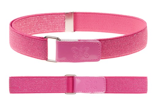 Pasek dla dzieci z regulowaną długością jest wykonany z wysokiej jakości taśmy elastycznej (gumy) o szerokości 2,5cm z brokatową nitką. Idealny na każdy dzień jak i wszelkie uroczystości. Posiada skórzane zapięcie na rzep z motywem motylka, z którym doskonale poradzi sobie każde dziecko. Dzięki regulacji długości pasek będzie służył dziecku przez wiele lat.