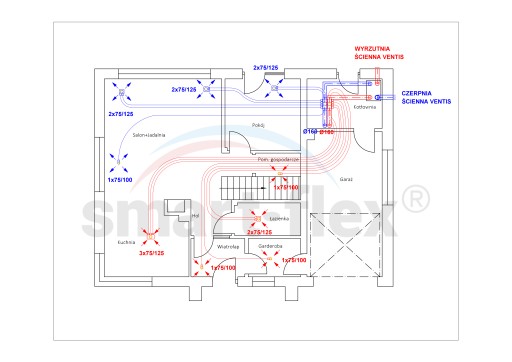Zaplanowanie rozprowadzenia instalacji, to niezwykle istotna kwestia. Z bilansu można wyczytać w ile i jakie skrzynki wentylacyjne należy się zaopatrzyć. To jednak schemat okazuje się niezastąpiony w wyliczeniach długości potrzebnych kanałów, ilości ewentualnych kolan i innych artykułów "strategicznych". Zaprezentowane poniżej schematy przedstawiają przykładowy szkic wstępny, udostępniony Państwu do akceptacji.