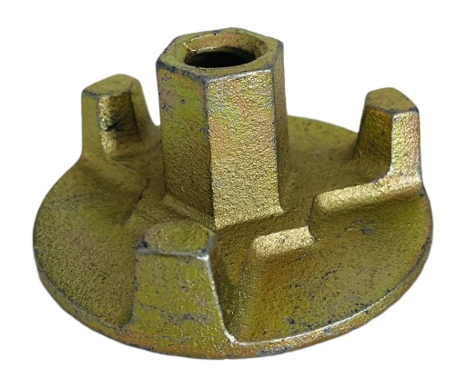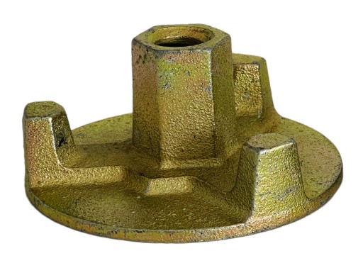 Nakrętka talerzowa wykonana z żeliwa ciągliwego białego i zabezpieczona powłoką cynkową.