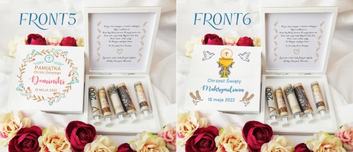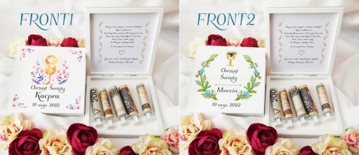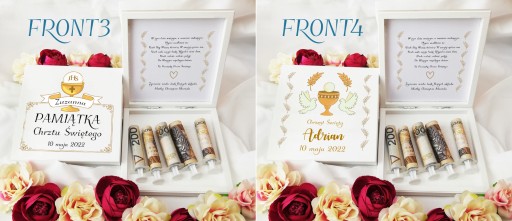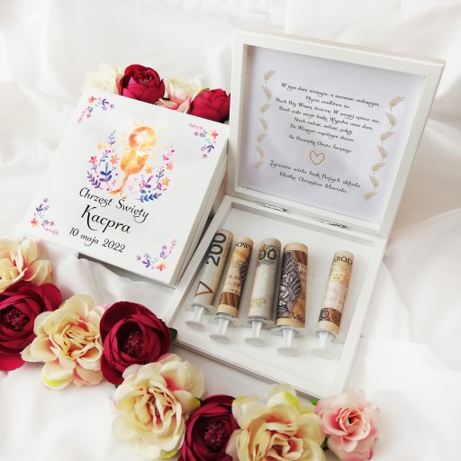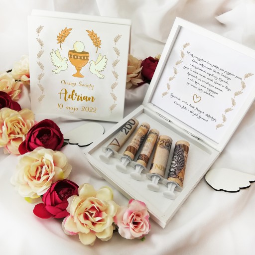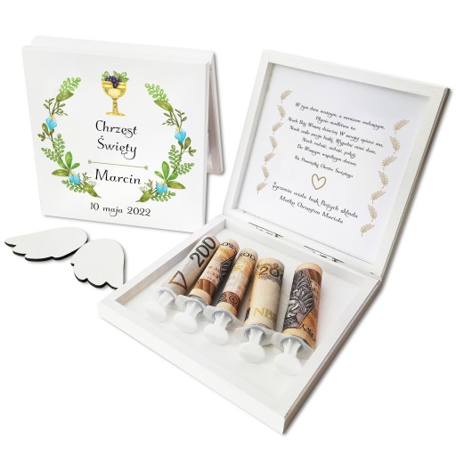 Wyjątkowe i niepowtarzalne pudełeczko, które kryje w sobie pieniądze oraz życzenia! To oryginalny upominek zarówno dla chłopca, jak i dziewczynki, które wstąpiło w Sakrament Chrztu Świętego. Będzie niezapomnianym i trwałym prezentem, idealnym na tak ważną okazję. Z pewnością doskonale odda wyjątkowy charakter tego wydarzenia. Na wieczku pudełka wykonany jest grawer, zaś w środku umieszczone są dwie kartki z dedykowanymi życzeniami i podpisem.
