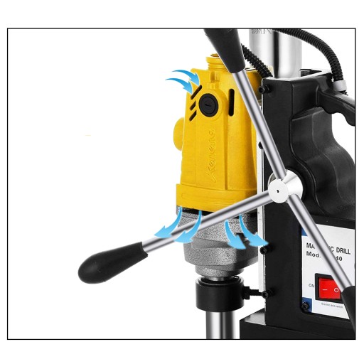 Przemyślany projekt i system chłodzenia: Ten ergonomiczny uchwyt zapewnia wygodny chwyt podczas pracy i transportu. Te 3 przedłużone korby są pokryte antypoślizgową gumą, co zapewnia oszczędność pracy. Zbiornik chłodziwa, pyłoszczelny wlot powietrza oraz otwory wylotowe powietrza służą do chłodzenia wiertarki magnetycznej podczas przegrzania.