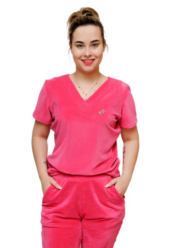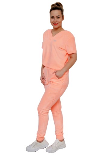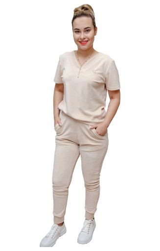 Klasyczny komplet składający się z bluzki i spodni, który świetnie sprawdzi się na co dzień. Luźna bluzka wspaniale współgra z jednokolorowymi spodniami. Produkt posiada dekolt w kształcie literki V z przodu i tyłu co wydłuża i wysmukla naszą szyję i dodaje lekkości .Krótkie rękawki, które będą świetnym rozwiązaniem na letnią, wakacyjną pogodę. Kieszonki umieszczone na spodenkach oraz gumka w pasie podkreślają sportowy charakter zestawu, natomiast przyjemny materiał sprawia, że komplet jest niezwykle wygodny. Jest to idealna propozycja na co dzień, na spotkanie ze znajomymi czy też wakacyjny wyjazd.