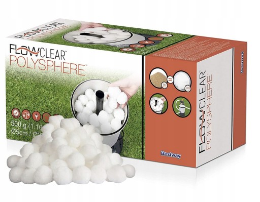 Uniwersalny wkład filtracyjny najnowszej generacji Polysphere Flowclear jest przyjazną dla środowiska alternatywą dla zwykłego piasku kwarcowego dzięki swojej dłuższej żywotności i doskonałym właściwościom filtracyjnym i retencyjnym. Specjalne kulki filtracyjne wykonane z mikrowłókien PET (politereftalan etylenu) o zróżnicowanej długości i strukturze są w stanie 10 razy szybciej i skuteczniej oczyścić wodę w Twoim basenie.