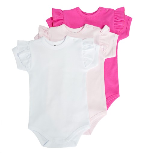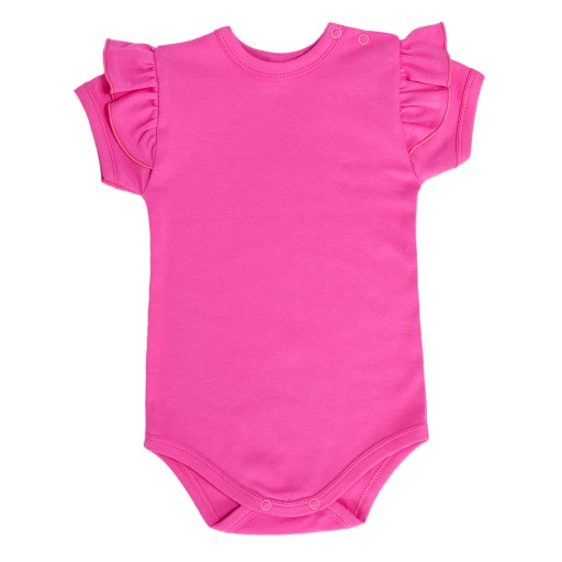 Klasyczne, wygodne i praktyczne body z krótkim rękawkiem i falbanką na ramionkach uszyte z wysokiej jakości bawełny posiadającej certyfikat Oeko-Tex Standard 100 Tekstylia godne zaufania.
