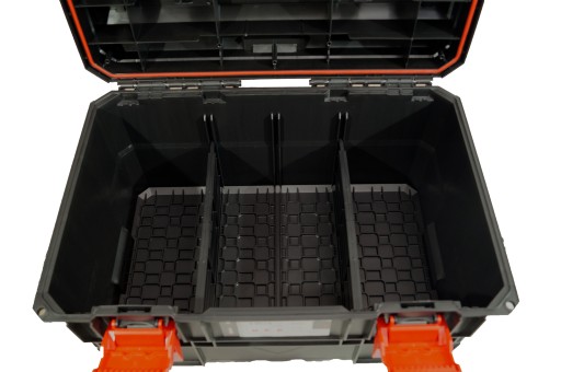 Szczelnie zaprojektowane skrzynie w wersji Tech wyposażone w litą uszczelkę to pyłoszczelne i odporne na działania wody pojemniki warsztatowe służące do przechowania i transportowania ciężkich narzędzi.