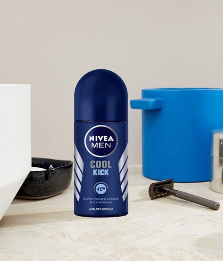 NIVEA Men Cool Kick Chłodzący antyperspirant w kulce dzięki zawartości mentolu zapewnia długotrwałą świeżość i orzeźwiający, męski zapach pobudzający zmysły. To prawdziwy zastrzyk energii na cały dzień! Dezodorant NIVEA zapewnia długotrwałą ochronę przed potem. Odświeżający antyperspirant pozostawia przyjemne uczucie czystości i gotowości na każde wyzwanie. Nie daj się pokonać poceniu. Dezodorant dla mężczyzn ma przyjazne dla skóry pH, dzięki czemu nie powoduje przesuszania się skóry pach. Męski zapach będzie Ci towarzyszyć cały dzień.