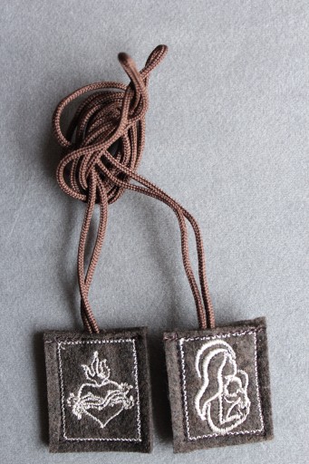 Szkaplerz Karmelitański składa się z dwóch skrawków wełnianego sukna koloru brunatnego.