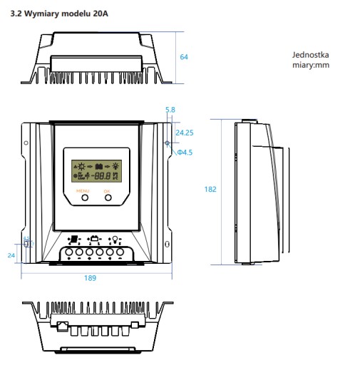 - Czterostopniowe ładowanie: MPPT, BOOST (impulsowe), Equalization (wyrównujące), Float (podtrzymujące)