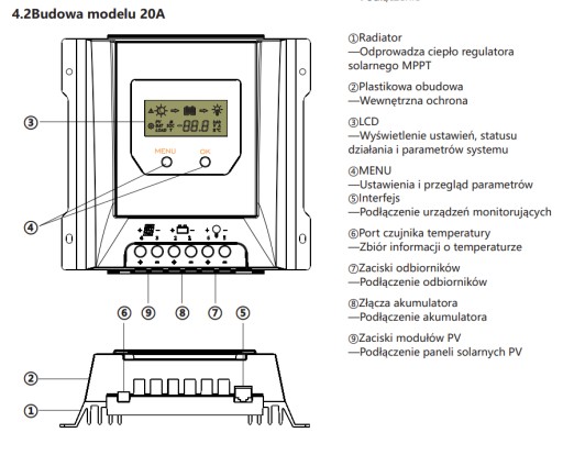 - Czujnik temperatury z automatyczną kompensacja temperaturową (jeżeli temperatura przekroczy ustawioną wartość, prąd ładowania będzie się obniżał w celu zbicia temperatury)