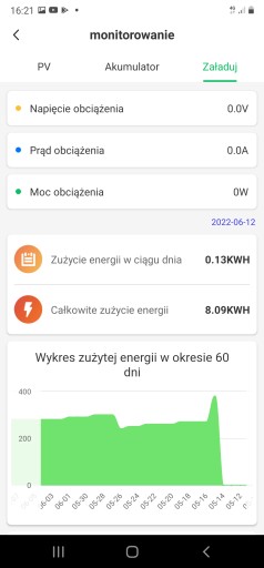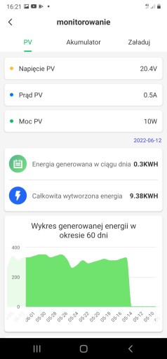 Wersja modułu z Bluetooth - ekran z aplikacji pokazujący energię dostarczaną z panela solarnego z wykresem uwzględniającym energie z 60 ostatnich dni .