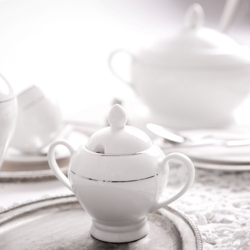 Wykonana z wysokiej jakości porcelany New Bone China. Wyjątkowo elegancka linia porcelany, ozdobiona delikatnymi srebrnymi liniami. Ze względu na wzornictwo nie zalecamy mycia w zmywarce i używania kuchence mikrofalowej.