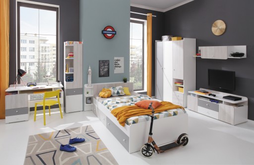 - meble młodzieżowe COMO dostępne w kolorystyce jak na zdjęciu szary+biały lux+ dąb wilton