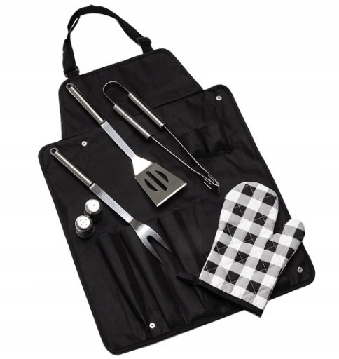 Nylonowy fartuch grillowy z 7-elementowym wyposażeniem. Wykonany z metalu oraz nylonu.