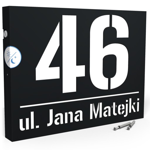 ✨ Tabliczka posiada wbudowany czujnik zmierzchu, tzn. że po zajściu słońca światła LED automatycznie się włączą.