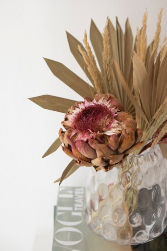 Suszony kwiat KARCZOCHA FIORE w beżowo-różowych tonach. Karczoch ma niezwykły kształt, dzięki czemu jest oryginalną dekoracją wnętrza. Roślina jest trwała, może latami służyć. To produkt naturalny, więc każda sztuka może różnić się wielkością.