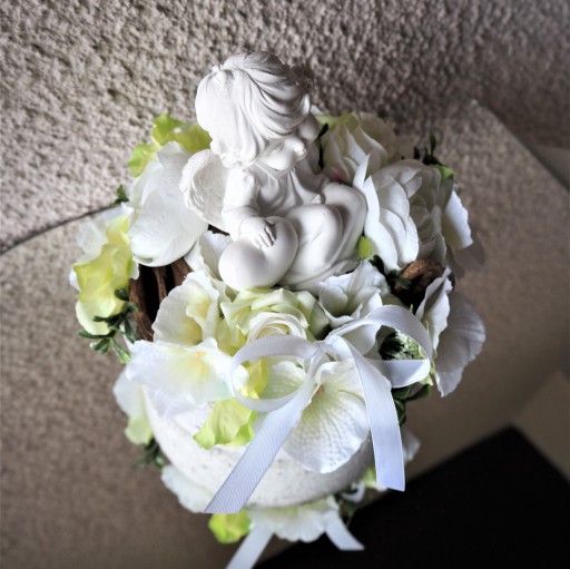 - Stroik przyciąga uwagę przeuroczym, uśmiechniętym aniołkiem który siedzi wygodnie wśród kwiatów trzymając w dłoni serduszko. Umieszczony w centrum kompozycji czyni go bardziej wyjątkowym!