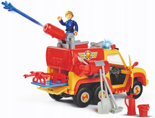 Wóz strażacki Venus stworzono w charakterystycznych dla Strażaka Sama barwach, czyli w kolorze czerwono-żółtym. Pojazd wyposażony jest w sześć gumowych kół, dzięki którym porusza się on nie tylko z łatwością, ale także stabilnie po wszelkich powierzchniach płaskich. Wóz posiada otwierane boczne drzwi, otwieraną przyczepę, w której można schować wszelakie akcesoria pomagające w akcjach ratowniczych. Samochód posiada także rozwijaną linę z hakiem. W zestawie znajduje się również figurka Penny o ruchomej głowie, ramionach i nogach, a także akcesoria strażackie m.in. kask ochronny, który można założyć na głowę figurki. Ponadto samochód wyposażono w efekt dźwiękowy - po naciśnięciu specjalnego, szarego przycisku, wóz wyda z siebie dźwięk syreny alarmowej oraz zaświecą mu się lampy. Dzięki funkcji strzelania strzałkami wodnymi (plastikowymi) zgasisz ogień nawet na wysokim budynku. Zabawka wymaga użycia baterii, które znajdują się w zestawie.