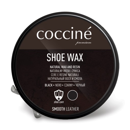 COCCINE SHOE WAX PASTA WOSK DO BUTÓW 40 ml CZARNA: Pasta w tradycyjnej puszce z „motylkiem” zawierająca wosk i żywice naturalne sprawia, że obuwie ze skóry licowej zyskuje głęboką barwę i połysk. Znakomicie kryje drobne uszkodzenia skóry, wygładza jej powierzchnię i chroni przed działaniem brudu oraz wody. Pastę należy stosować na skórę wyczyszczoną środkiem Leather Cleaner, następnie po wyschnięciu polerować. Puszka metalowa, 40 g. SHOE WAX doskonale odżywia kolor, chroni i nabłyszcza skórę. Uwaga: chronić przed dziećmi! Parametry: