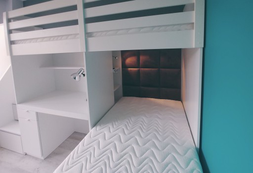 Na zagłówku dolnego łóżka znajdują się panele tapicerowane oraz wnęka z półkami.
