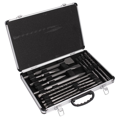 Zestaw składa się z wytrzymałych wierteł, dłut i szpiców z mocowaniem SDS+.