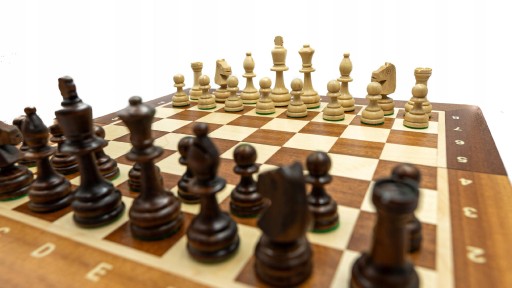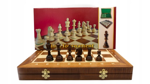 Szachy wykonane z drewna grabowego, obciążane metalem. Kaseta intarsjowana mahoniowo-jaworowa.