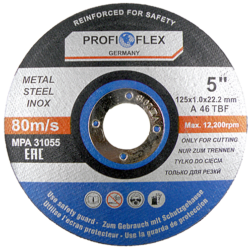 Tarcza do cięcia stali płaska wykonana jest z elektrokorundu. Przeznaczona jest do przecinania: stali twardych i miękkich, żeliwa, staliwa, aluminium w postaci prętów, kształtowników, rur, płyt, cienkich profili i blach, oraz do cięcia poprzecznego sztab metalowych i drutów.