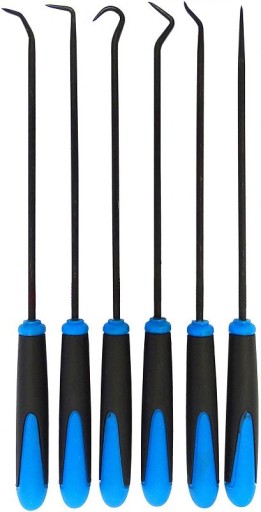 Zestaw 6 śrubokrętów haczykowych. Komplet znajduje zastosowanie głównie przy demontażu oringów i różnego typu uszczelek. Rękojeść z antypoślizgowego materiału zapewnia pewny chwyt.