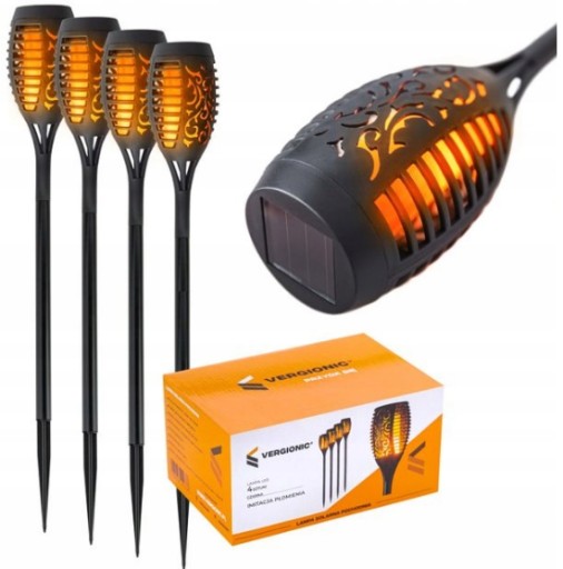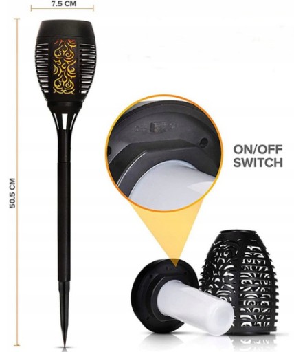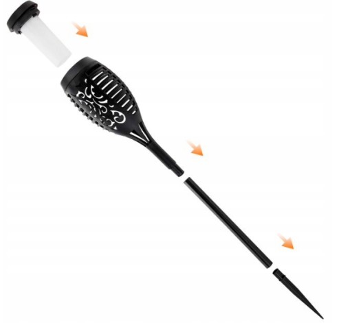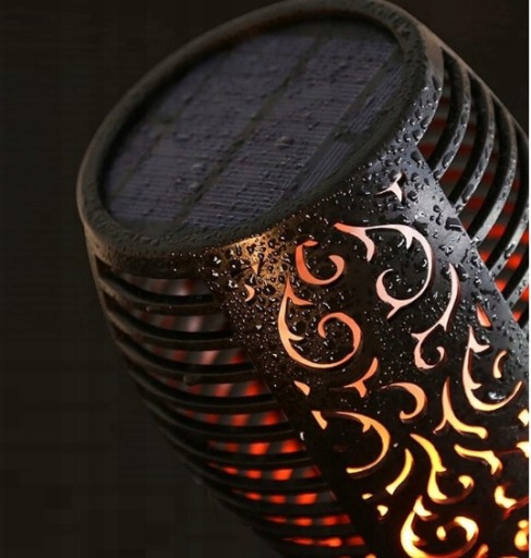 - Wysoko wydajne panele solarne zamienia energię słoneczną na energię elektryczną i przechowuje ją w akumulatorkach lampy. Podczas zmroku pochodnia włącza się samoczynnie, wykorzystując zgromadzoną energię elektryczną