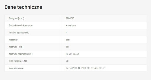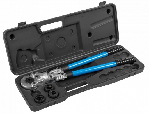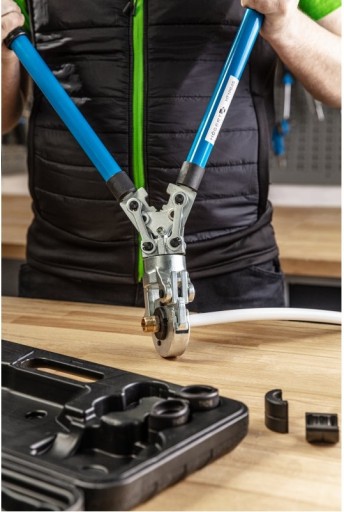 Ręczna praska do zaciskania złączek na rurach PEX-AL-PEX oraz PE-RT-AL-PE-RT. Teleskopowe rękojeści umożliwiające wydłużenie ich z 58 cm do 76 cm, zwiększając w ten sposób siłę konieczną do zakucia złączki. System szybkiej wymiany matryc pozwala w łatwy sposób wymienić matryce w zależności od potrzeb.