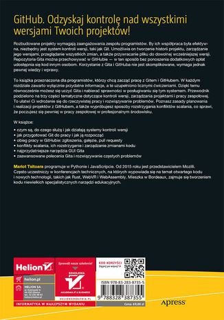 To książka przeznaczona dla programistów, którzy chcą zacząć pracę z Gitem i GitHubem. W każdym rozdziale zawarto wyłącznie przydatne informacje, a te uzupełniono licznymi ćwiczeniami. Dzięki temu równocześnie możesz się uczyć Gita i nabierać sprawności w posługiwaniu się tym systemem. Przewodnik podzielono na trzy części tematyczne dotyczące kontroli wersji, zarządzania projektami i pracy zespołowej. To ułatwi Ci wdrożenie się do rzeczywistej pracy i rozwiązywanie problemów. Poznasz zasady planowania i realizacji projektów z GitHubem, a także wypróbujesz sposoby rozstrzygania konfliktów scalania, co sprawi, że poczujesz się pewniej w pracy zespołowej w profesjonalnym środowisku.