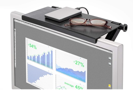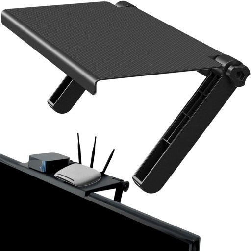 Półkę można zamontować na każdym monitorze lub telewizorze z płaskim ekranem. Dzięki regulowanym podpórkom nie potrzebujesz narzędzi do instalacji. Wystarczy położyć na górnej części ekranu, wyregulować podpórki i zablokować dokręcając pokrętło.