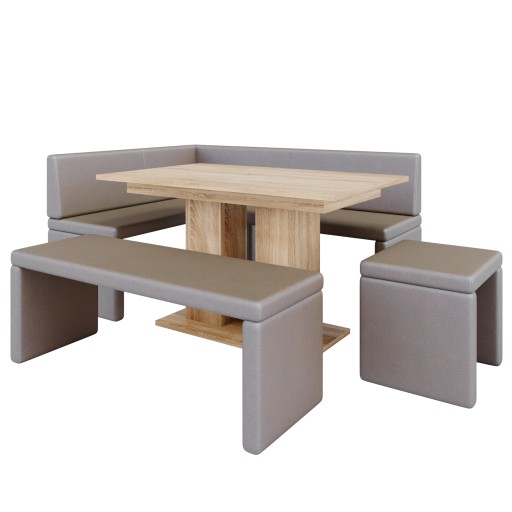 Narożnik kuchenny Olga jest w całości tapicerowany, wykonany w tkaninie lub eko-skórze o podwyższonej odporności na ścieranie. Nowoczesny design sprawia, że zestaw pasuje zarówno do kuchni czy też jadalni, ale również do minimalistycznego salonu.
