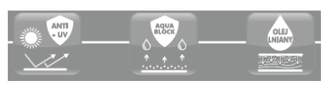 - AQUA-BLOCK – hydrofobowa formuła zapobiega wnikaniu kropli wody w powierzchnie.