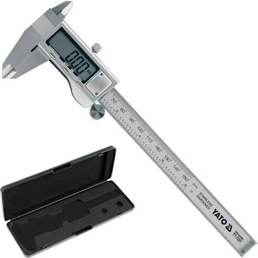 - Suwmiarka elektroniczna YATO wykonana ze stali nierdzewnej, posiada dokładność 0,02 mm oraz zakres pomiarów 0-150 mm.