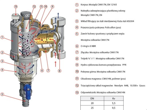 Mosiężny hydro-cyklonowy filtr magnetyczny DN25 1 1/4" europejskiego producenta BRASS FORM. Główne zalety filtra to silny magnes neodymowy, obracalna obudowa oraz wkład filtrujący ze stali nierdzewnej.