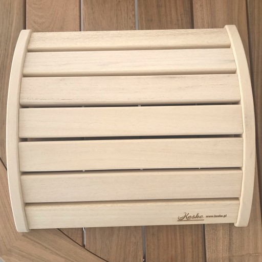 Firma KESKE zajmuje się również akcesoriami do saun. Wszystkie produkty wykonywane są ręcznie z najwyższa precyzją, dzięki czemu są trwałe i niepowtarzalne. Zagłówek łączony na kołki zapewnia piękny wygląd bez widocznych otworów czy wkrętów. Dodatkowo wykonany jest estetyczny grawer.