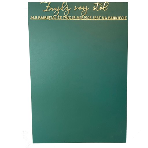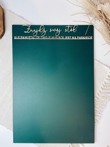 Drewniana, malowana na kolor butelkowa zieleń z naklejanymi wycinanymi laserowo w złotej plexi.