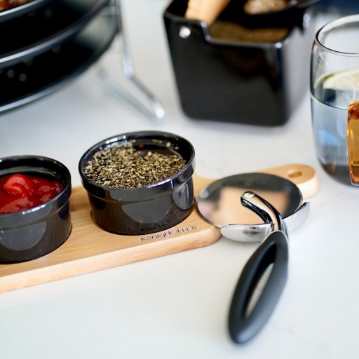 Miseczki do dipów na desce bambusowej Konighoffer 4 x 100 ml wykonano z czarnej porcelany NBC. Nadają się również do podawania sosów do pizzy, zakąsek oraz przekąsek. Komplet wykorzystasz na przyjęciu lub ułatwisz sobie organizację wieczoru filmowego. Same miseczki umyjesz bezpiecznie w zmywarce. Stabilnie przeniesiesz zestaw na desce z drewna bambusowego, która ma wgłębienia na miseczki. Wymiary deski to 39,7 x 9 x 1 cm. Wszystkie elementy zostały wykonane precyzyjnie. Ich wysoka jakość produkcji przekłada się na wieloletnie użytkowanie oraz bezpieczeństwo w kontakcie z żywnością. Produkt ma rekomendację Ewy Wachowicz. Jako ambasadorka marki Konighoffer, gorąco i z uśmiechem poleca go ona do domowego użytku. Razem z nim zdobędziesz twój przepis na dom. To jedna z najlepszych opcji w tej kategorii!