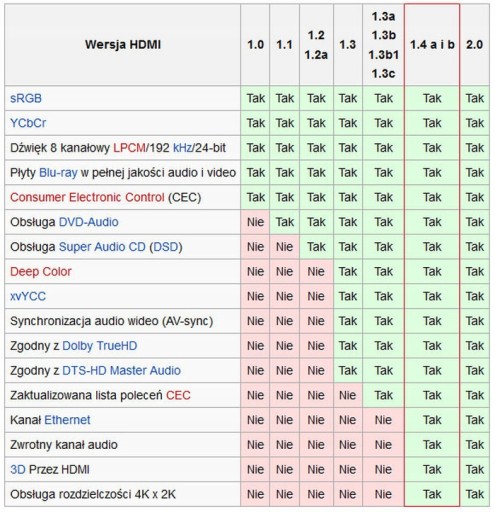 - sRGB, YCbCr, xvYCC, Depp Color - obsługuje