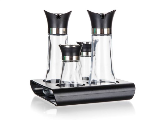 Skład zestawu: pojemnik na olej 110 ml, pojemnik na ocet 110 ml, solniczka 60 ml, pieprzniczka 60 ml i podstawka.